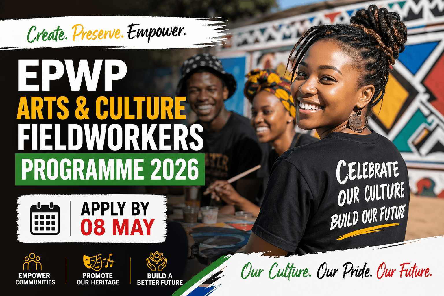 Free State Department of Sport, Arts, Culture and Recreation is looking for unemployed South African youth to join the EPWP Arts and Culture Fieldworkers Programme 2026. The deadline is 08 May 2026, so you need to act now.